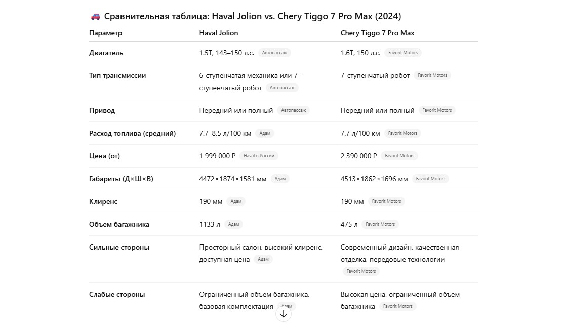 Не будем останавливаться на каждой погрешности, но ошибки в результатах генерации есть в обоих результатах. Например, ChatGPT допустил неточность с объемом багажника Chery, а Perplexity вообще не указала точный расход топлива для этого автомобиля. Тем не менее ChatGPT оказался сильнее: он заметил нашу «хитрость» с вариативностью характеристик в зависимости от комплектации и указал диапазоны в таблице, что делает его выводы информативными.