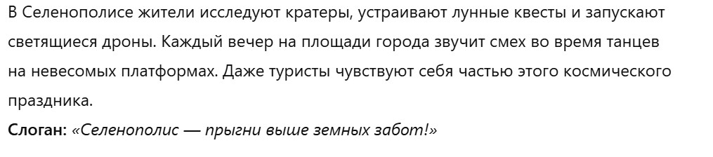 Представь, что ты создаешь рекламную кампанию для вымышленного города на Луне. Напиши короткий рассказ (500 знаков) о жителях этого города, их уникальных развлечениях и традициях. Включи слоган, который будет использоваться для продвижения города туристам с Земли. История должна быть креативной, захватывающей и с элементами юмора.