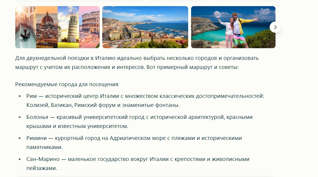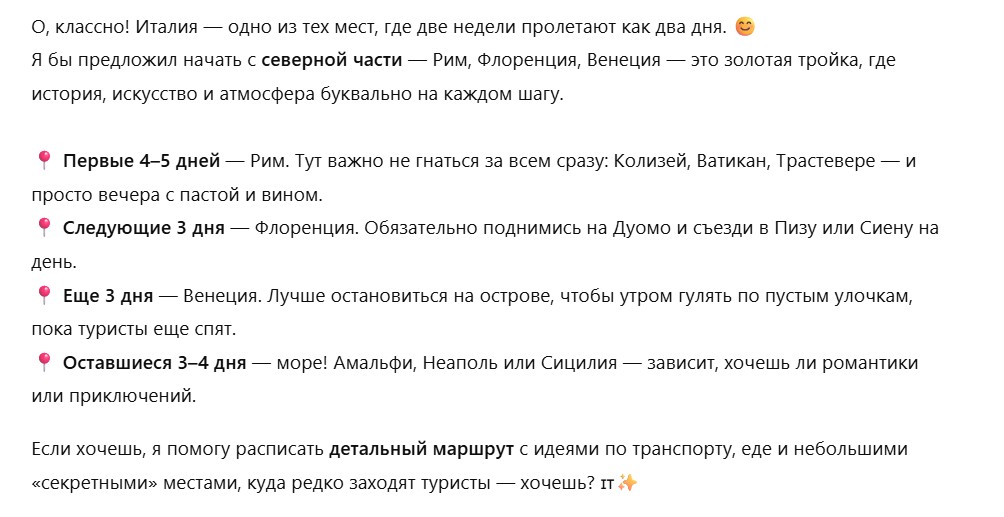 1. Я хочу поехать в Италию на две недели, но не знаю, какие города лучше всего посетить и как распределить время. Что бы вы посоветовали?