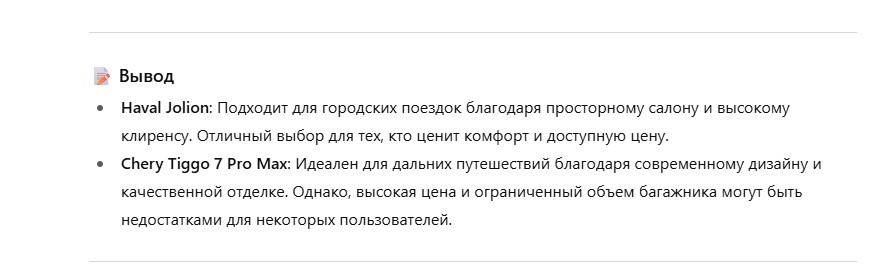 Сравни два популярных китайских кроссовера 2024 года: Haval Jolion и Chery Tiggo 7 Pro Max. Составь таблицу с колонками: технические характеристики (мощность, тип трансмиссии, расход топлива), сильные стороны, слабые стороны, стоимость и удобство эксплуатации. В конце сделай краткий вывод, какая модель лучше подходит для городских поездок, а какая — для дальних путешествий.