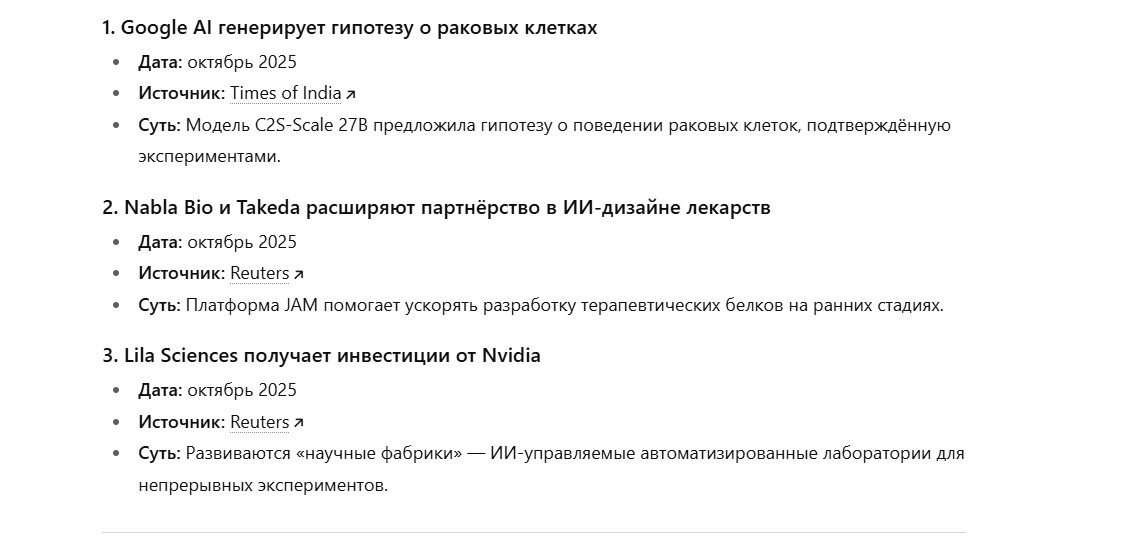Perplexity AI справилась с вопросом значительно быстрее. Вариант этого ИИ показывает спектр значимых событий куда обширнее, а факты соответствуют реальности. Ответ от GPT больше сосредоточен на биотехнологиях и практическом применении ИИ в науке. Он конкретный и актуальный, но довольно однобокий.