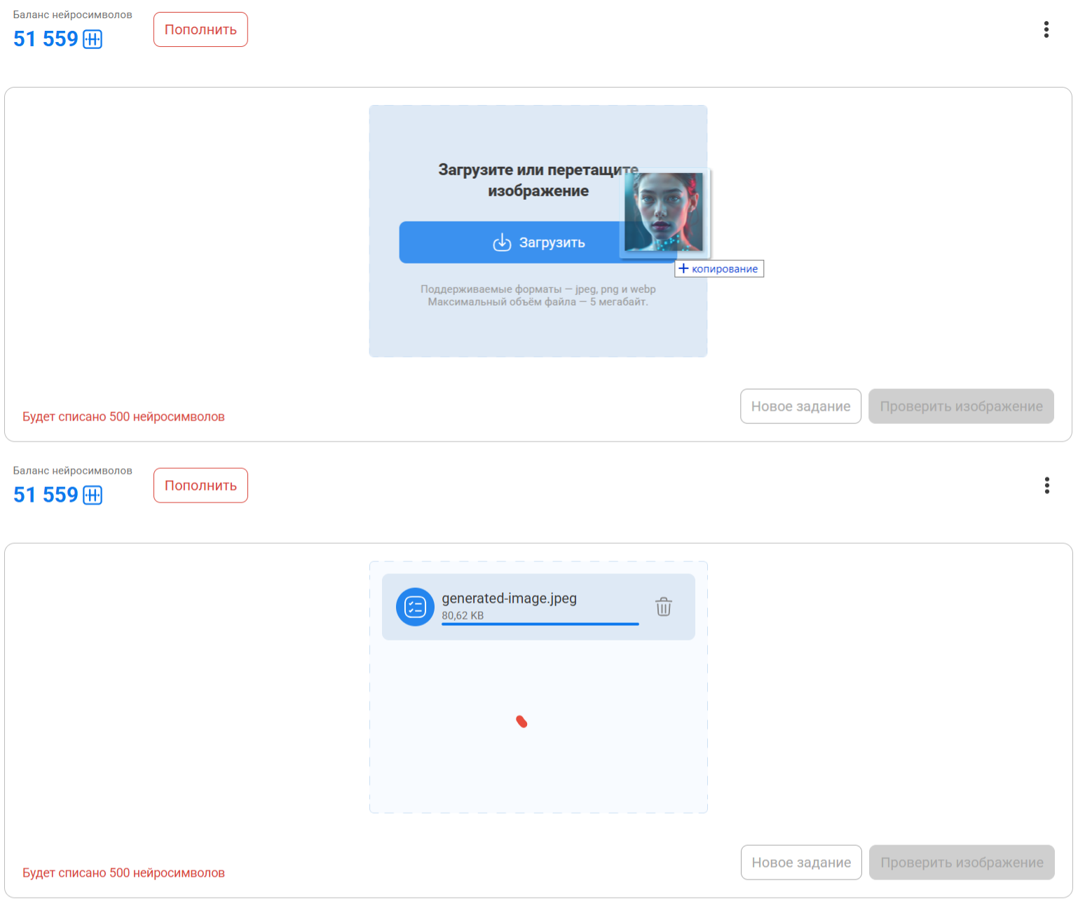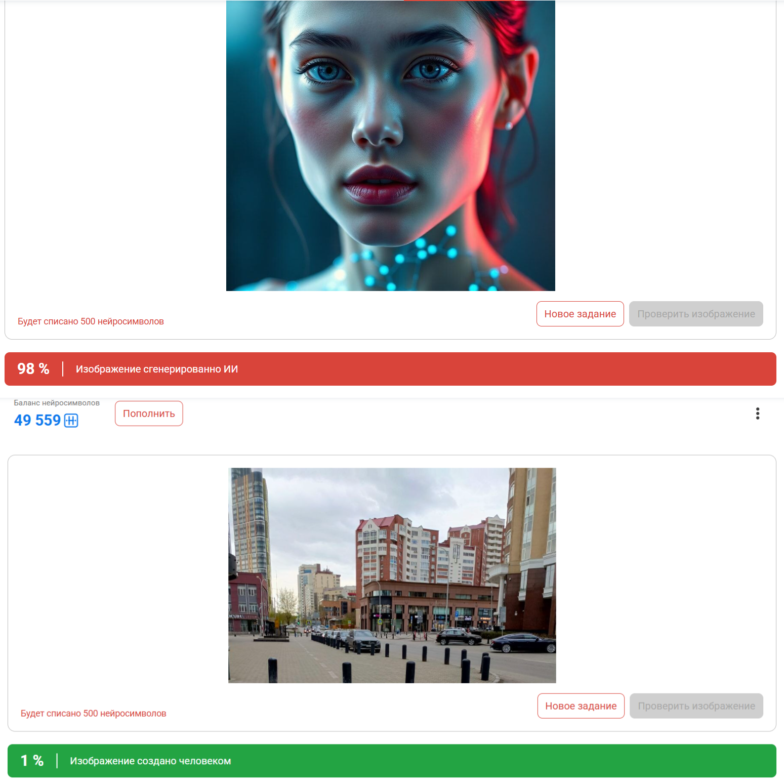 - Стоимость одной проверки изображения на ИИ — 500 нейросимволов.