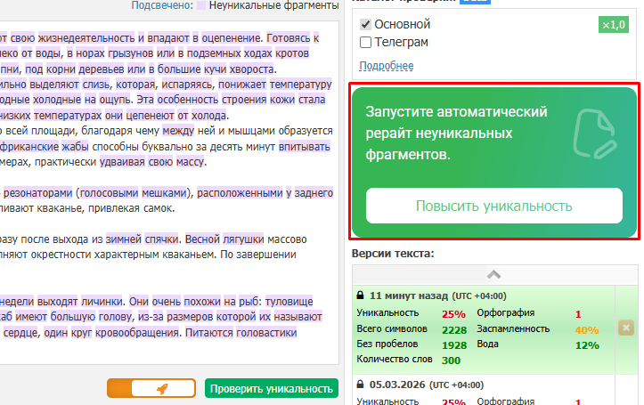 Уникальность текста можно проверять с помощью нашего Телеграм-бота — https://t.me/antiplagiat_robot