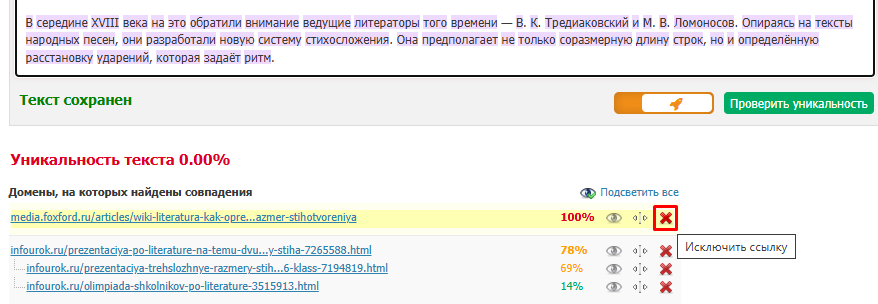 Для этого надо нажать кнопку "Исключить адрес/ссылку", и проверка автоматически изменит свой предыдущий результат. Тогда вы увидите уникальность текста без учета вашего сайта или отдельной страницы.