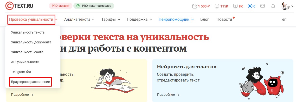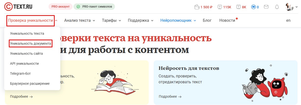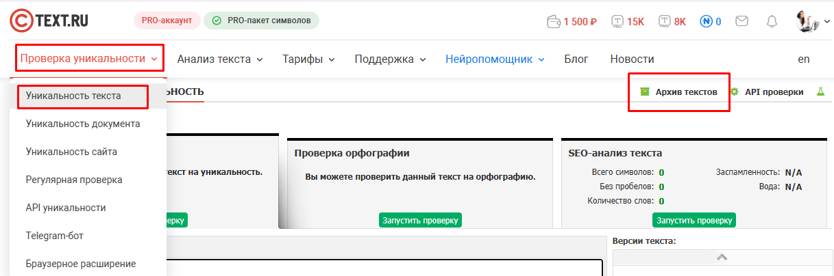 Проверить текст объемом до 8000 символов вы можете как бесплатно (если вы зарегистрированы), так и с использованием любой подключенной платной опции: PRO-аккаунта, PRO-пакета символов.