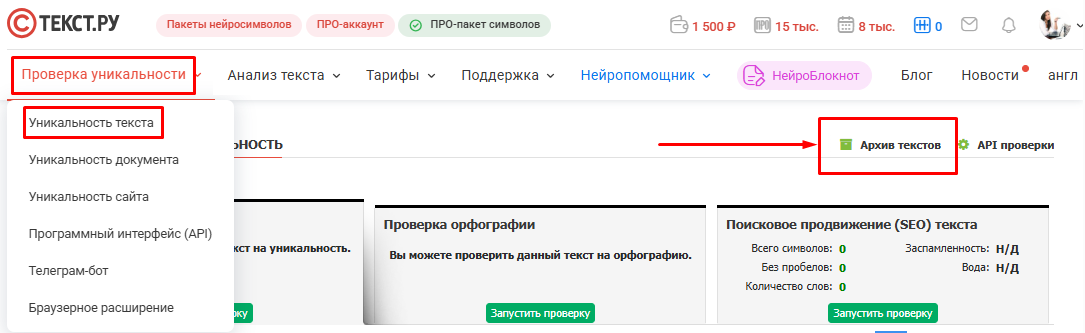 В верхней панели Сайта раскройте вкладку "Проверка уникальности". Перейдите на страницу «Уникальность текста» и нажмите на ссылку «Архив текстов».