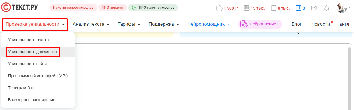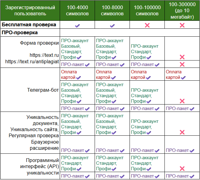 Проверить текст объемом до 8000 символов вы можете как бесплатно (если вы зарегистрированы), так и с использованием любой подключенной платной опции: ПРО-аккаунта, ПРО-пакета символов.