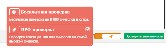 Для использования Бонус-пакета при проверке уникальности текста переключите тумблер под формой ввода текста на режим ПРО-проверки.