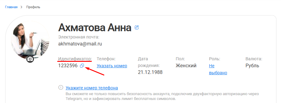 Идентификатор (ID) указан в соответствующем поле, его можно скопировать, нажав на пиктограмму.